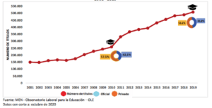 Según información del Ministerio de Educación a finales de 2020, solo el 72% de los recién graduados de una carrera de pregrado se encuentran cotizando a la seguridad social; lo que lleva a la conclusión de que el 28% o se encuentra desempleado o en trabajo informal.